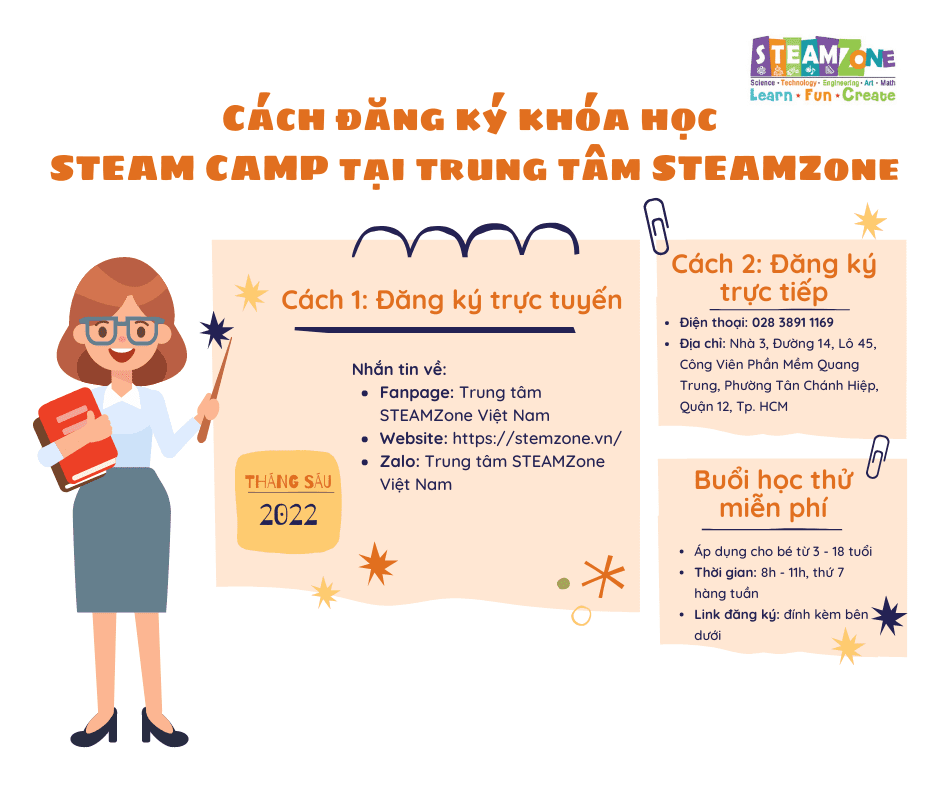Bạn muốn đăng ký cho trẻ tham gia vào các buổi học STEAM CAMP tại trung tâm STEAMZone? Vậy cách thức đăng ký là như thế nào? Có ưu đãi nào cho trẻ đăng ký trong tháng 6 này không?