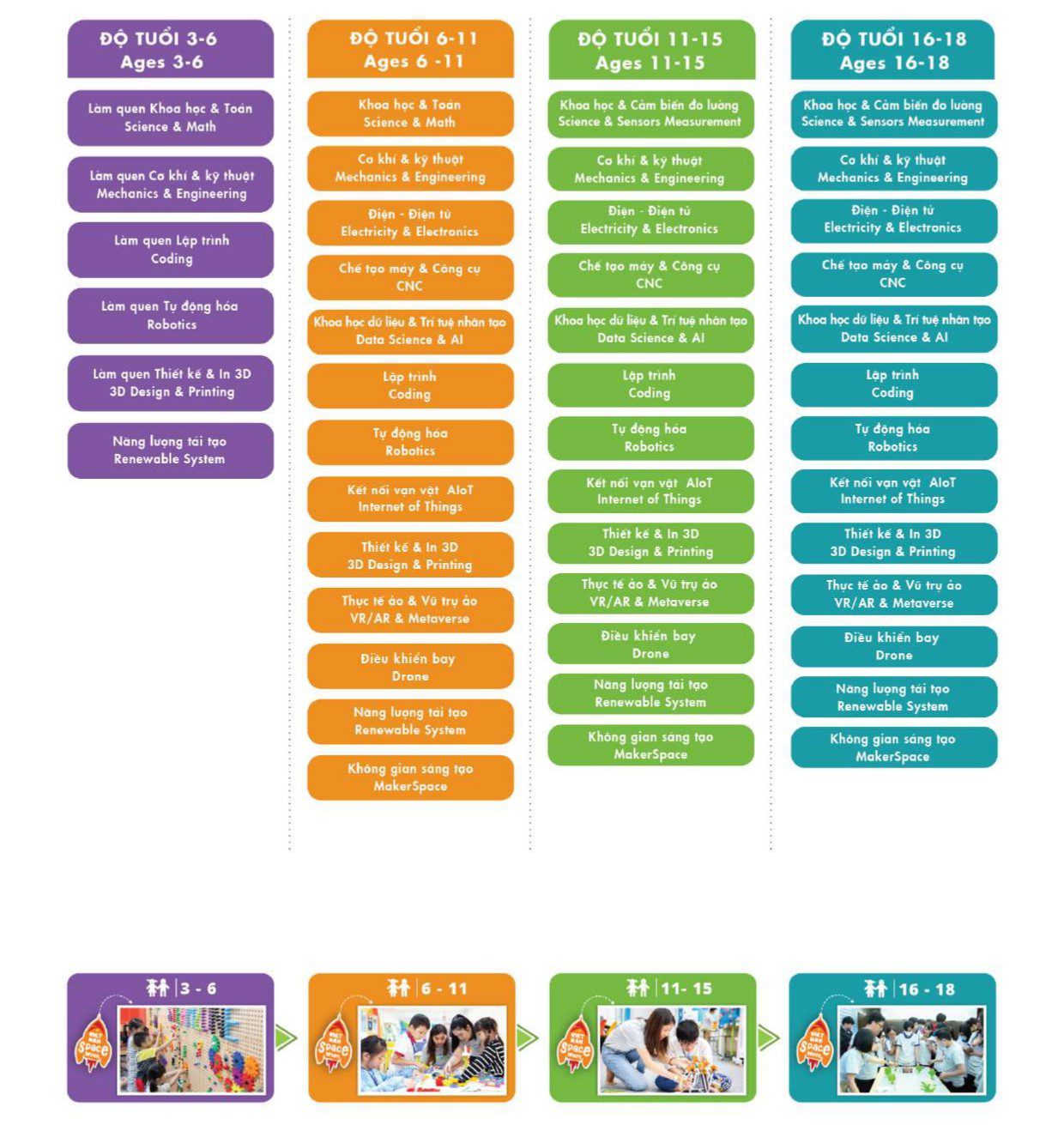 - Chương trình STEM với hơn 30 lĩnh vực, được thiết kế chuẩn mực quốc tế và bám sát nội dung chương trình giáo dục dành cho mọi độ tuổi từ 3 đến 18 tuổi.