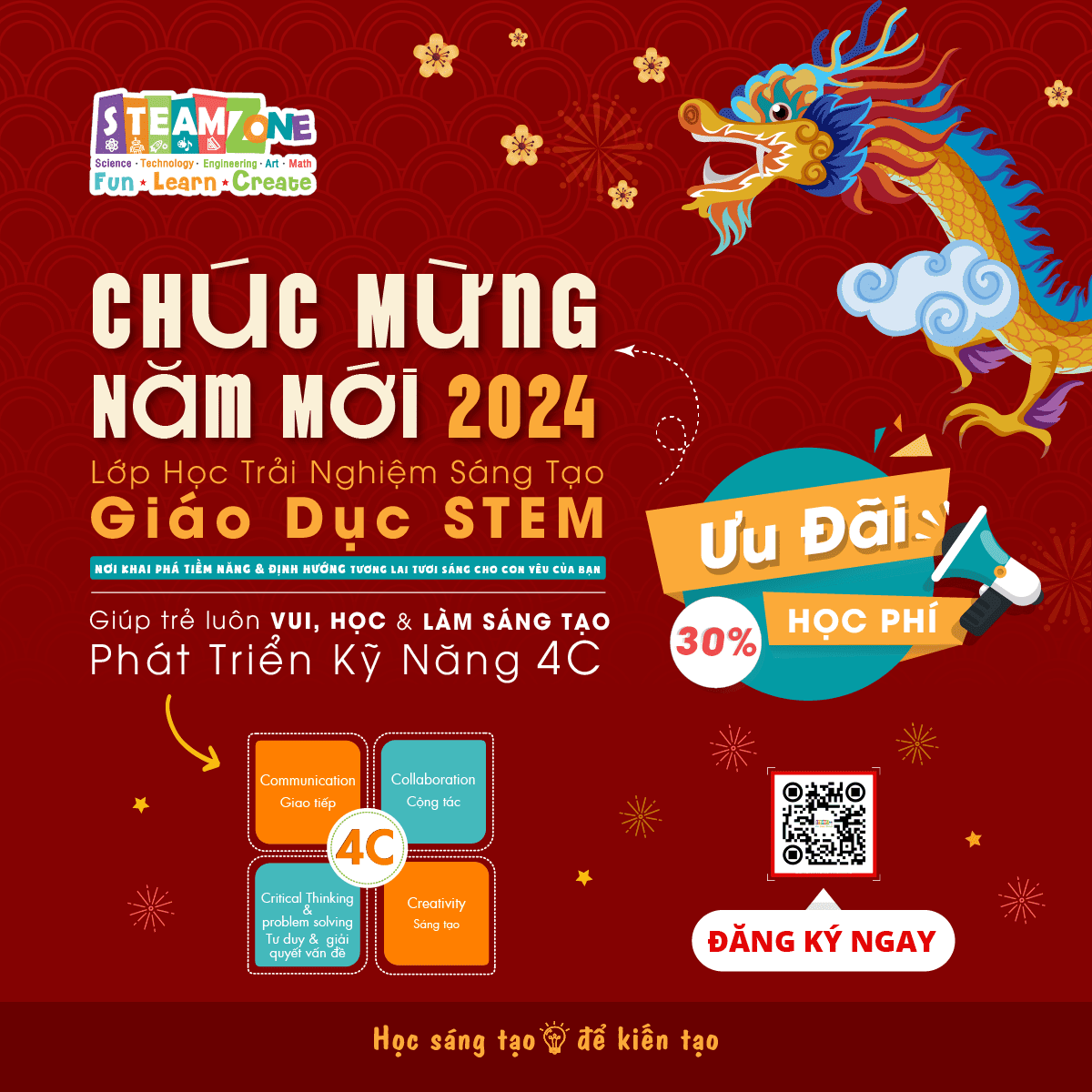 Chào xuân năm mới, Trung tâm Giáo dục STEAMZone kính chúc Quý đối tác, Quý thầy cô, Quý phụ huynh cùng các em học viên, một năm 2024 sung túc và thịnh vượng!