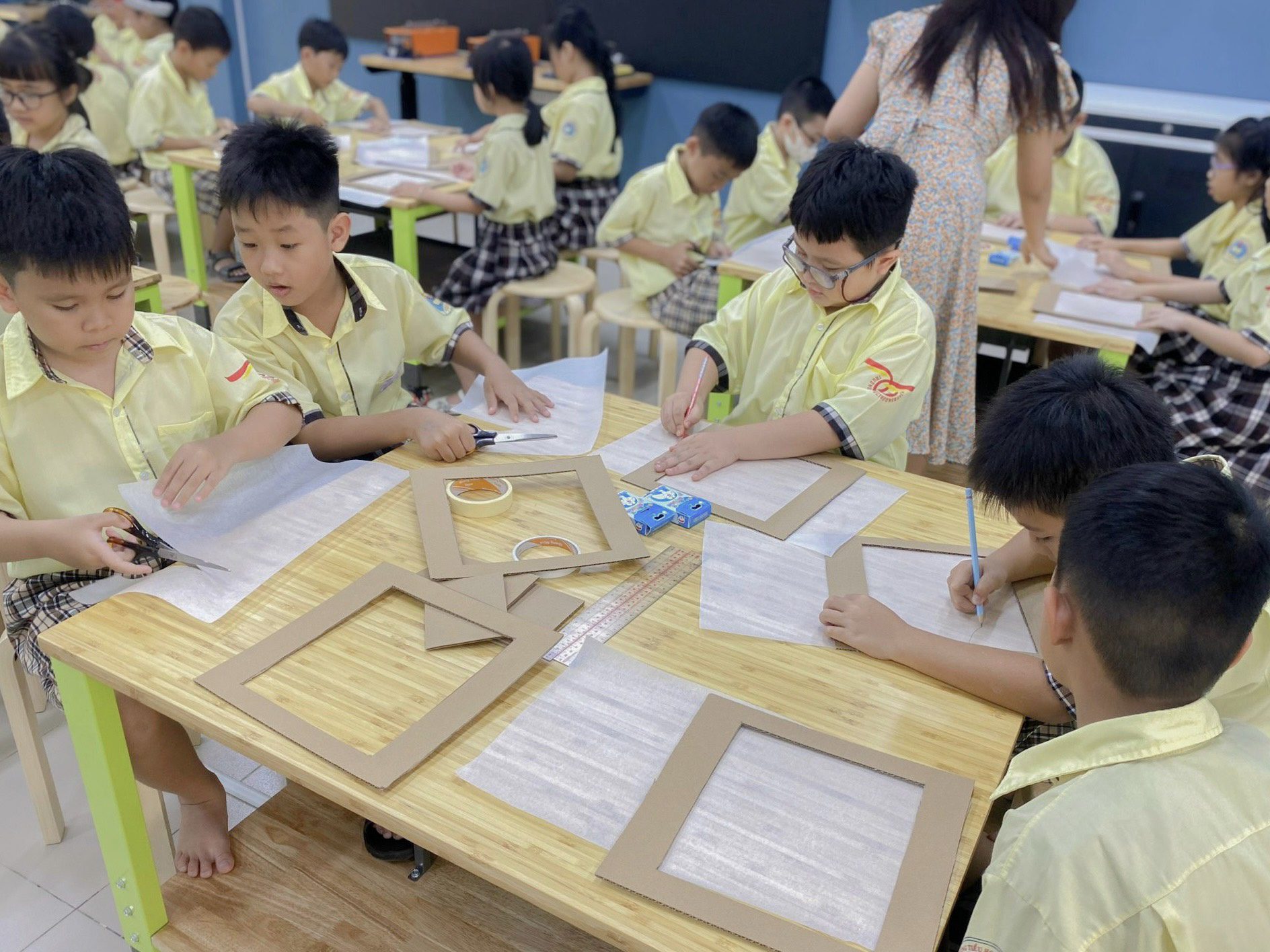 Các em học sinh tham gia tiết học STEM đầu tiên tại phòng học STEM của trường