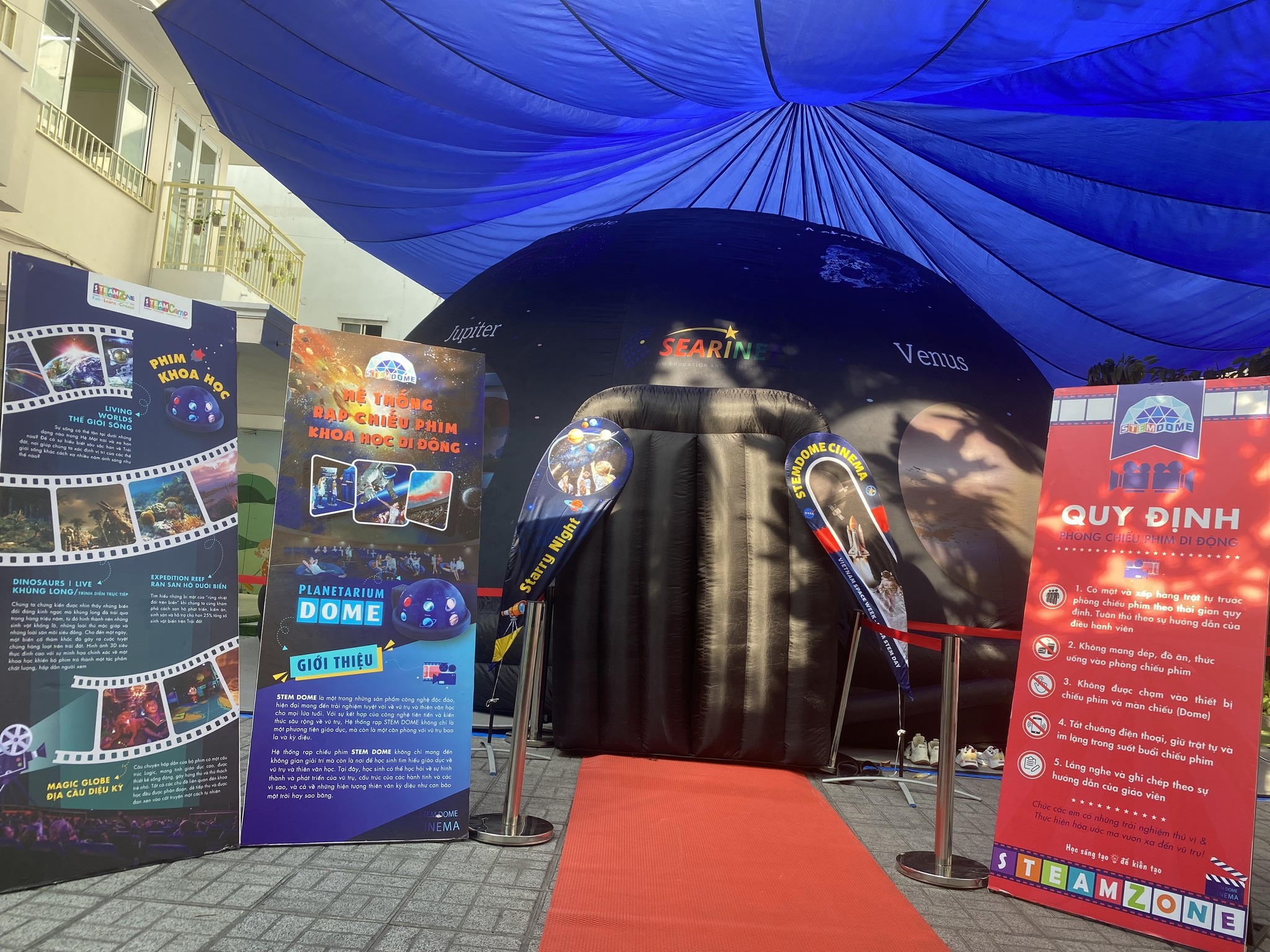 STEM DOME là một hệ thống rạp chiếu phim khoa học di động, được thiết kế như một mái vòm khổng lồ có thể chứa nhiều trẻ em bên trong. Khi bước vào STEM DOME, các em sẽ được đắm mình trong những bộ phim khoa học với màn hình cầu khổng lồ, mang lại cảm giác sống động như thật. Những bộ phim này được chọn lọc kỹ lưỡng, bao gồm các chủ đề về vũ trụ, thiên văn học, công nghệ và sinh động vật , giúp các em mở rộng kiến thức và kích thích sự tò mò khám phá thế giới xung quanh.