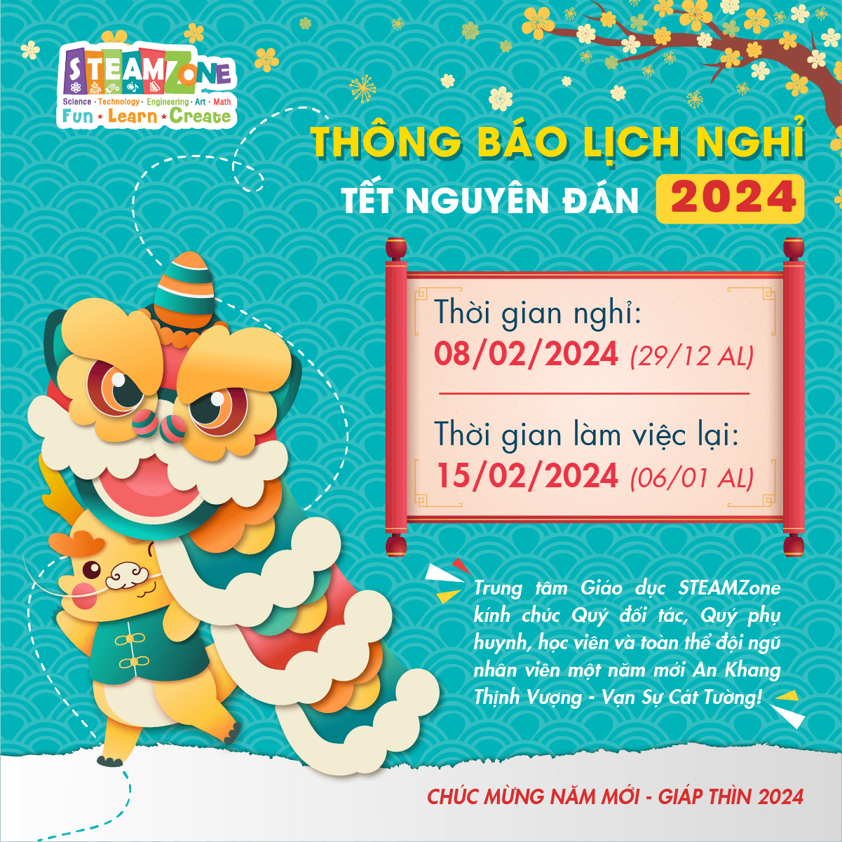 Trung tâm Giáo dục STEAMZone xin thông báo lịch nghỉ Tết Nguyên Đán 2024 như sau: