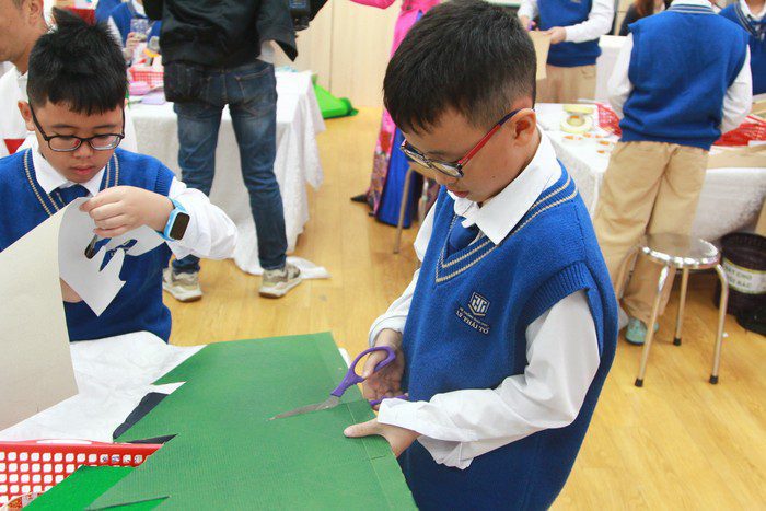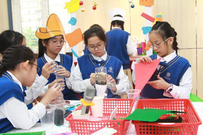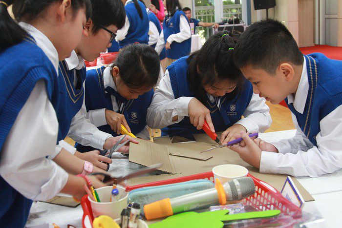 Giáo viên đã chia 4 nhóm gồm Thợ xây, Thợ mộc, Thiết kế và Khoa học để các em thực hiện các ý tưởng, sản phẩm.