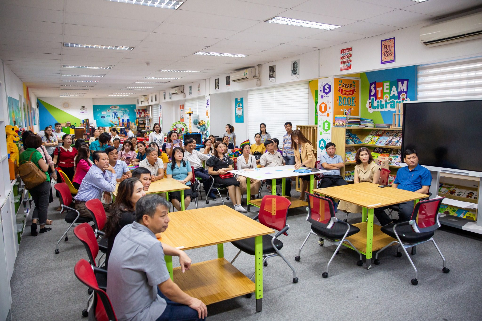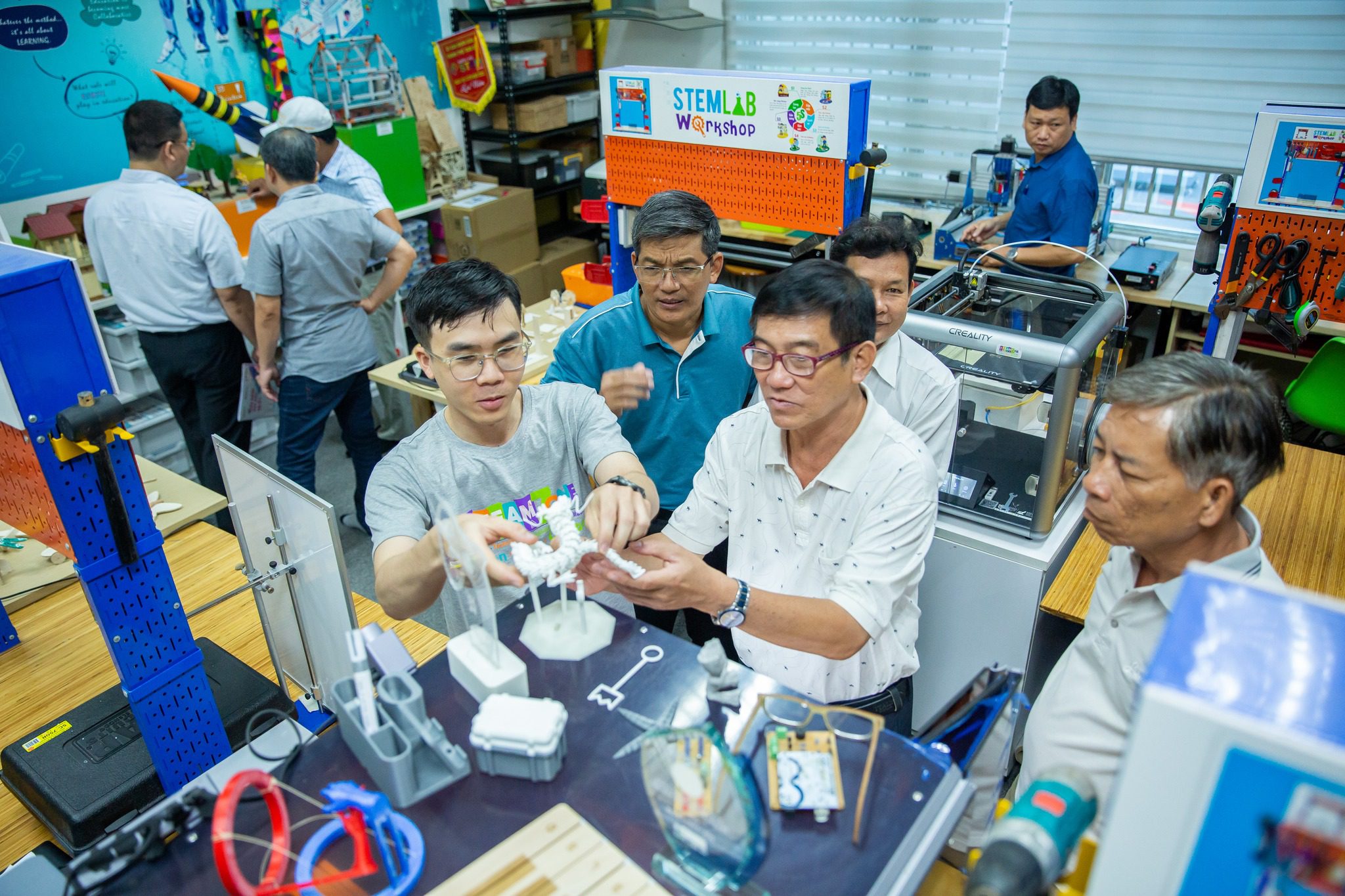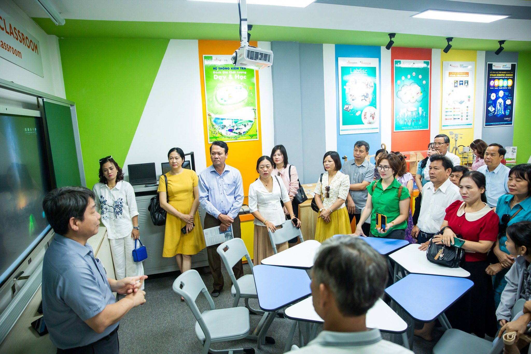 Chuyến tham quan này, các thầy cô đã được tham quan và trải nghiệm phòng học thông minh tích hợp giáo dục STEM với công nghệ hiện đại về Robotics, lập trình,… Bên cạnh đó, đoàn còn được tận mắt chiêm ngưỡng những sản phẩm STEM do các bạn mầm non, tiểu học, THCS thực hiện.